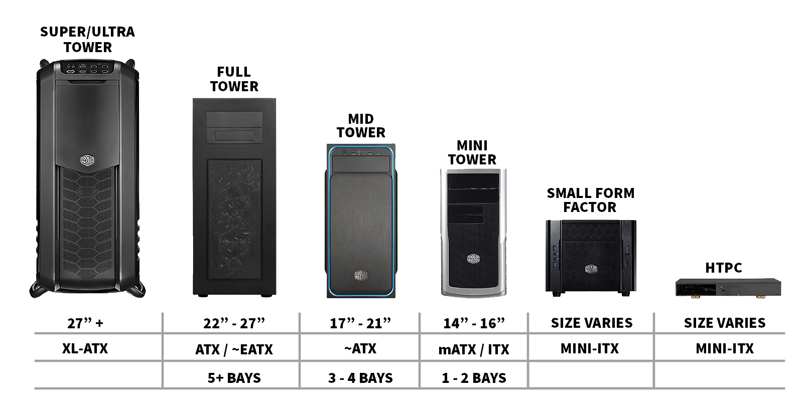 accommodate (largest to smallest) an ATX, micro-ATX, or ITX motherboard.